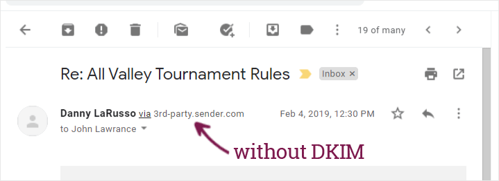 Build up your reputation as an email sender on your own domain name. Sending an email without authentication is like handing in an exam without your name on it. You may have aced the exam, but you can’t take credit for it without your name on it. DKIM signs your email as truly from you and will help build your reputation as an email sender.